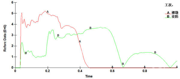 曲線A為未設置橋梁防撞設施的橋墩所受的船舶撞擊力,曲線B為設置了橋梁防撞設施后橋墩所受的撞擊力。從圖中曲線趨勢可以看出,設置防撞設施后,能夠明顯降低船舶撞擊力,延長撞擊時間,達到保護橋墩的目的。